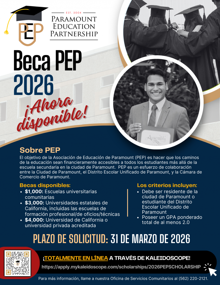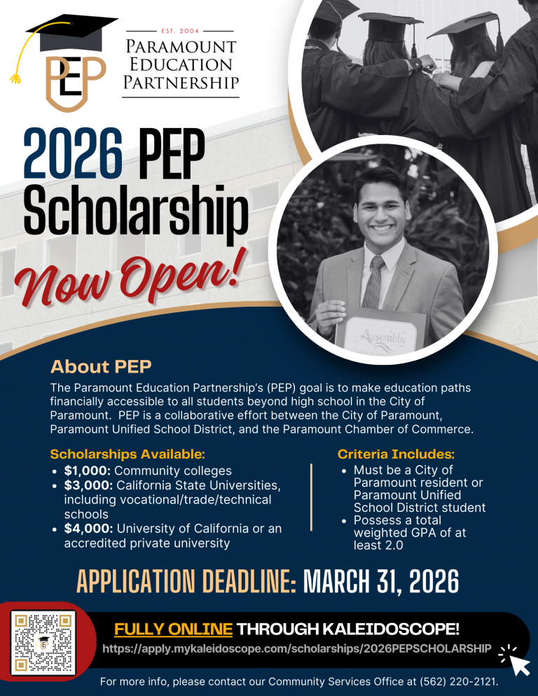 The Paramount Education Partnership (PEP) awards annual college scholarships to local students attending a two- or four-year college or technical school through the generous donations of local businesses and individuals. Amounts range from $1,000 to $4,000.