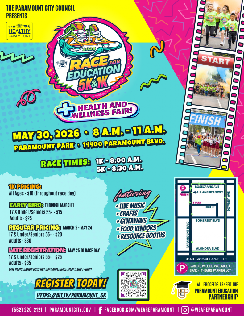 Join us on May 30 at Paramount Park (14400 Paramount Blvd.) for the Race for Education 5K/1K and Wellness Fair.