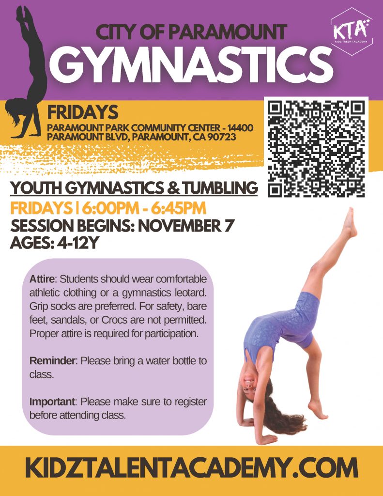 - Youth Gymnastics/Tumbling (4-12 yrs): Fridays, 6:00 P.M.