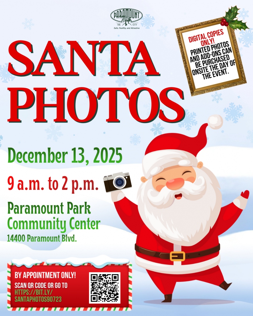 Santa will be taking photos on Saturday, December 13, from 9 a.m. to 12 p.m. at the Paramount Park Community Center.