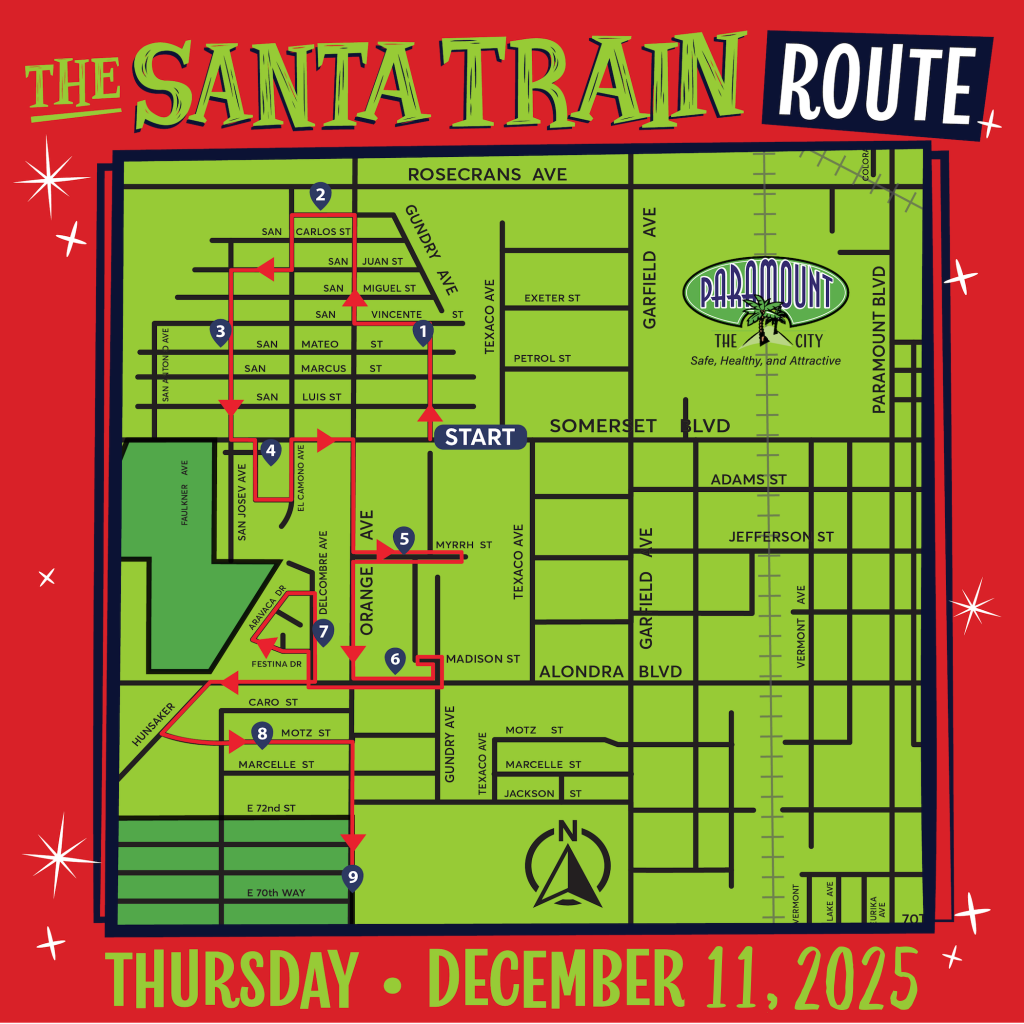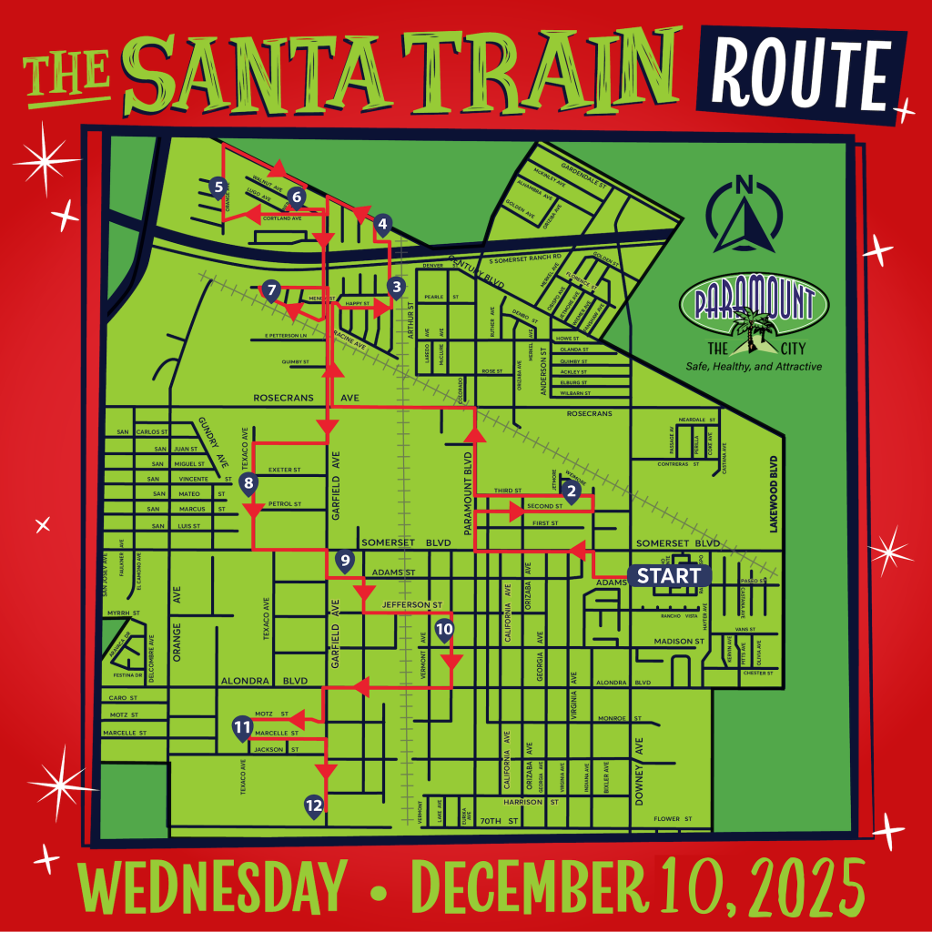 For over 50 years, the Santa Train has been a beloved tradition for families in Paramount. Catch the festive ride from Monday, Dec. 8, to Thursday, Dec. 11, starting at 3 P.M. Santa will be at each stop, ready for photos and to share apples and candy canes.