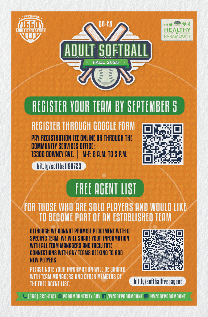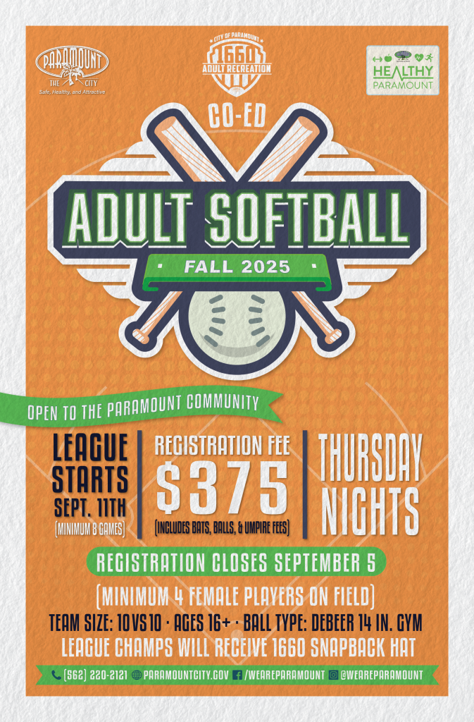 Gather your team of ten players per side, ages 16 and older. Exclusively open to Paramount residents and workers. Registration is $375 per team and includes bats, balls, and umpire fees.