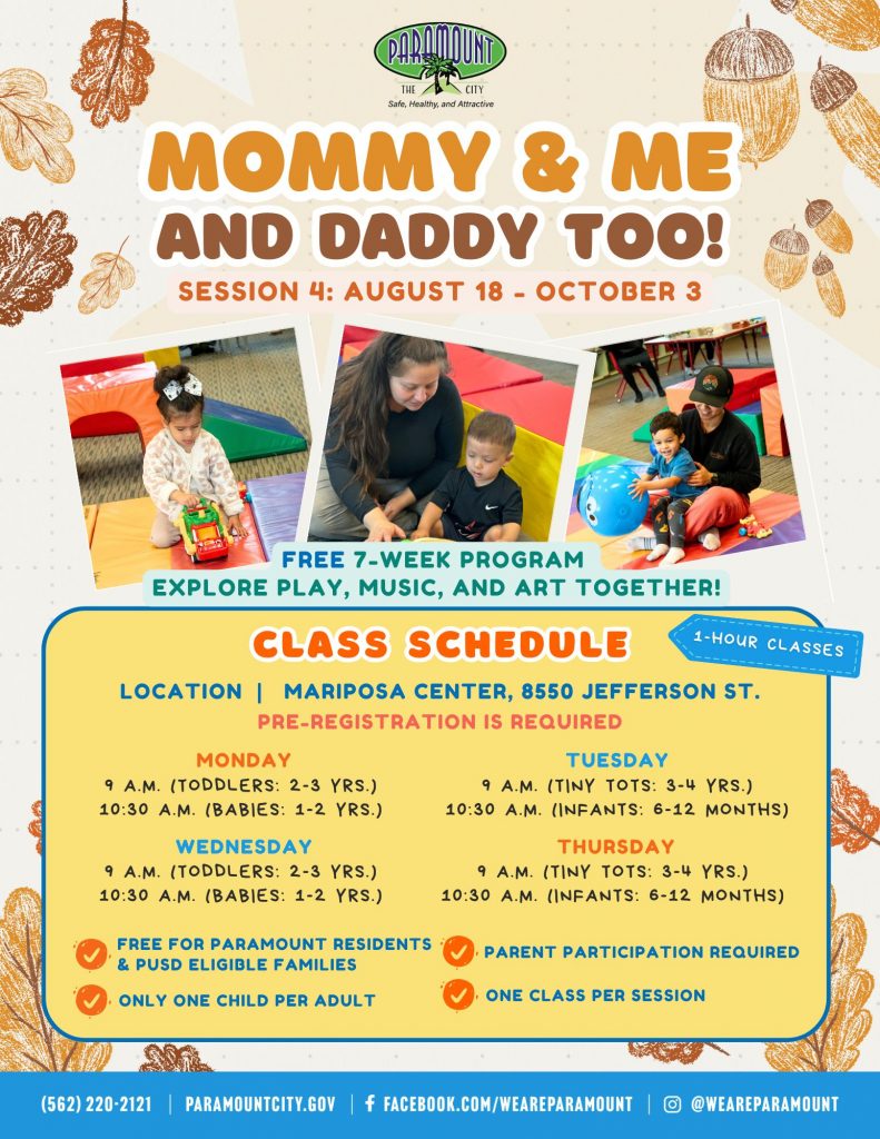 Come and spend quality time with your baby, infant or toddler. Children will explore hands-on activities with the help of their parents. Parent participation is required. One child per adult. Free to all Paramount residents and anyone living within the PUSD area.